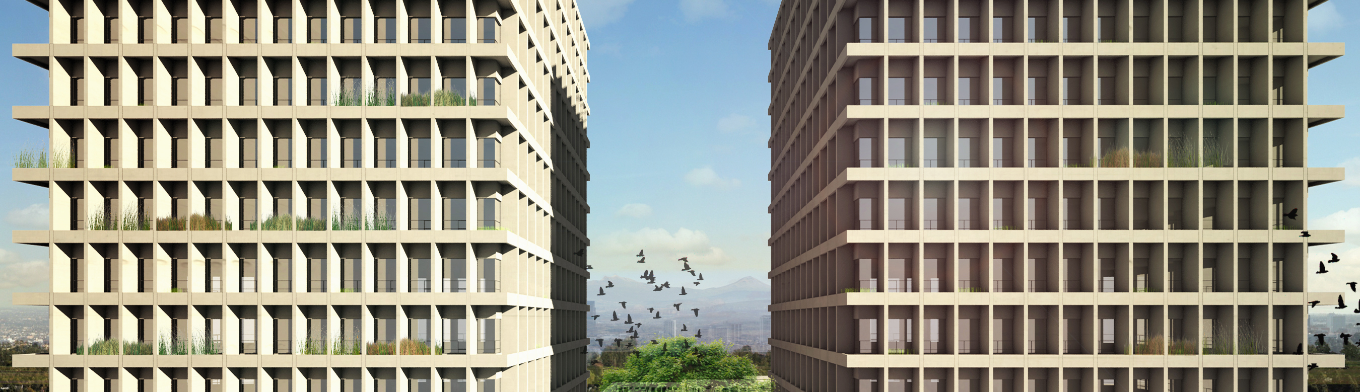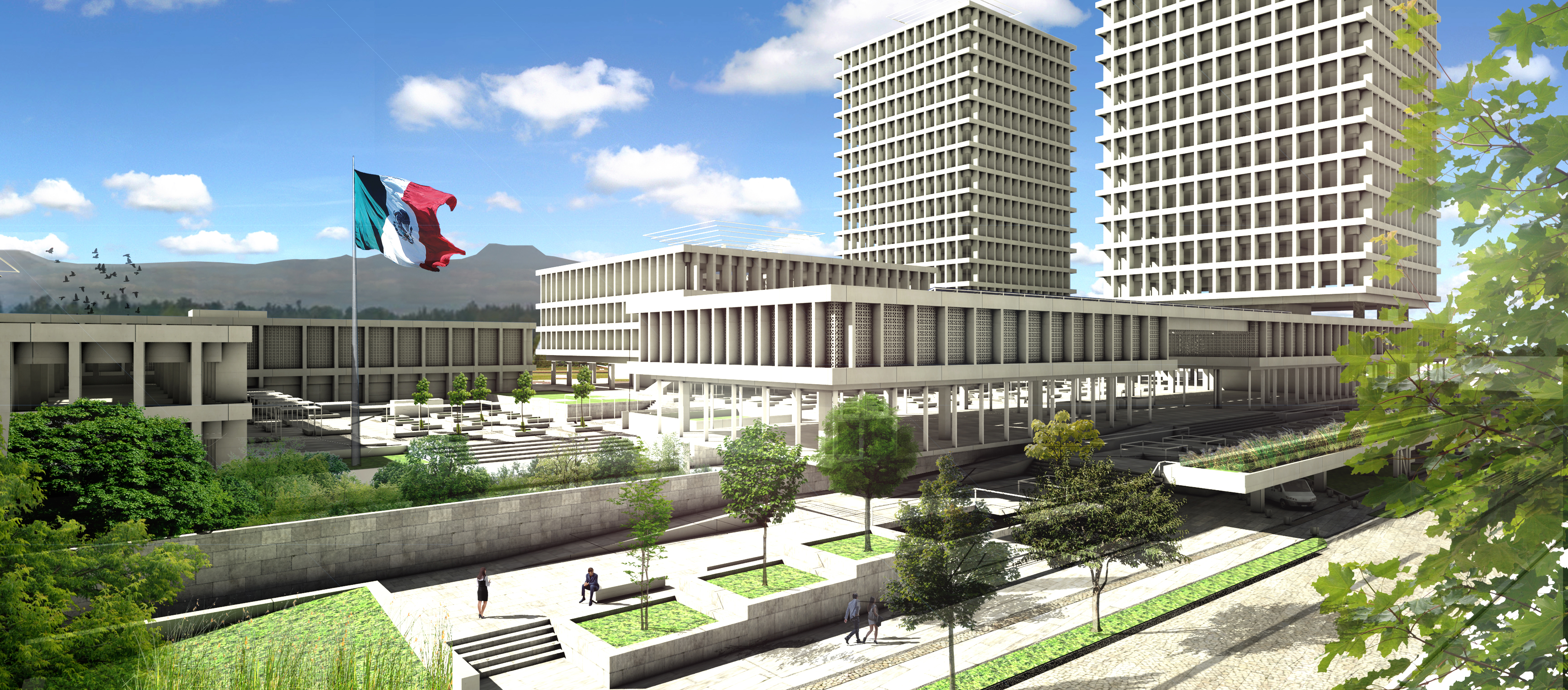 Equipamos el conjunto con dos torres de oficinas, soportadas por un basamento, donde, una macrosala de usos múltiples y el museo de la democracia en el edificio pórtico hacen al conjunto más transparente.